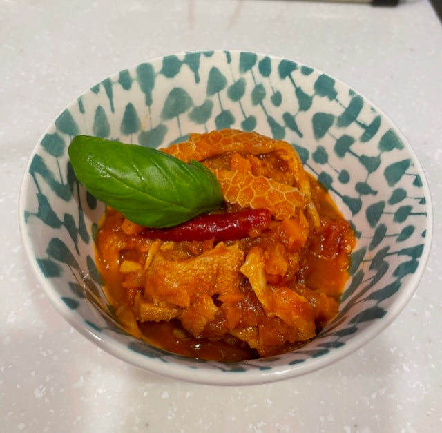 丁寧にした処理を施した胃袋は、ほのかな甘みと香りがあり、モツのにおいからはかけ離れた上品さです。